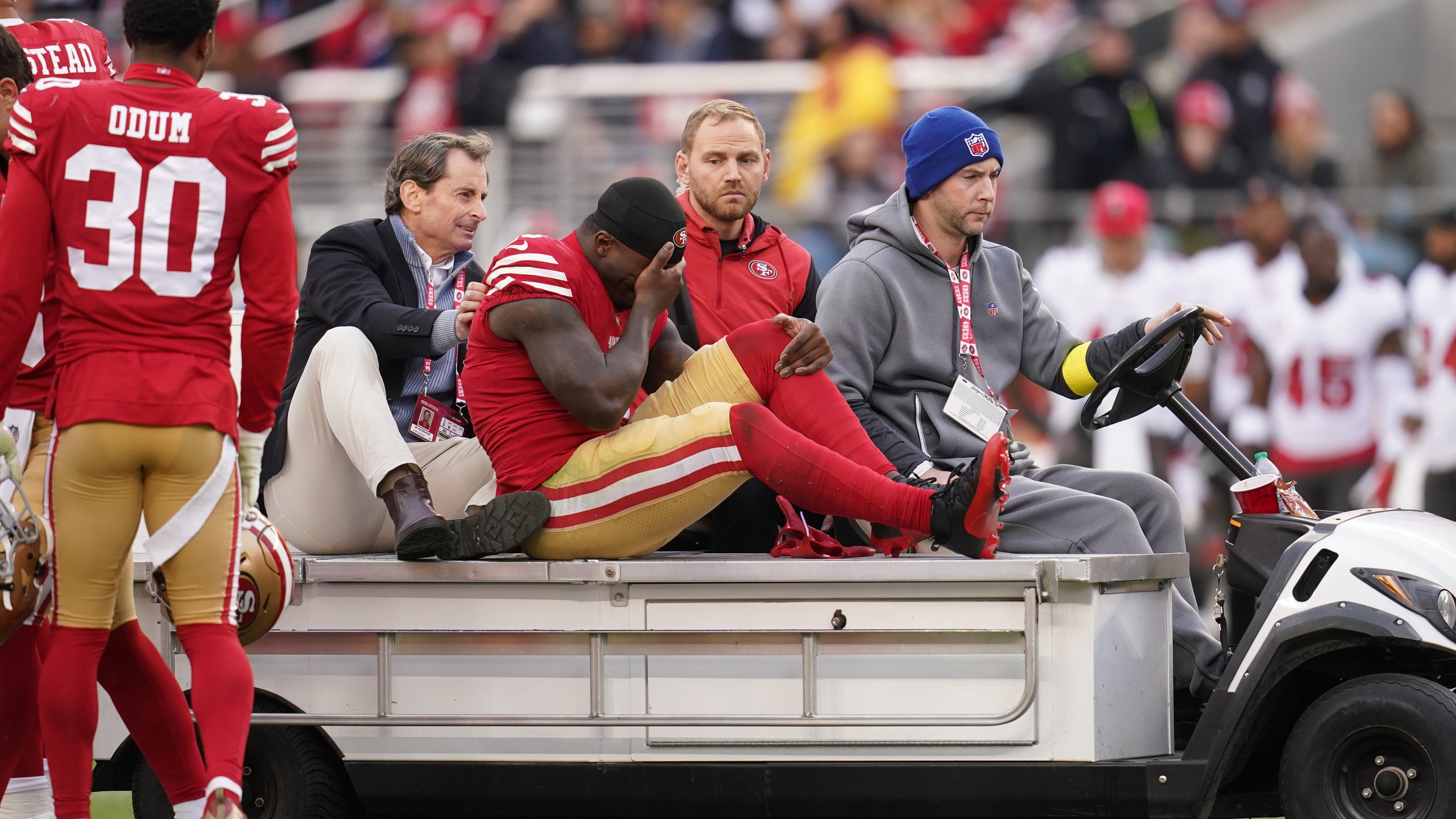 49ers Deebo Samuel. Deebo Samuel is officially questionable to return with a knee injury. San Francisco 49ers star Deebo Samuel was looking glum as he was carted off the field Sunday in a game against the Tampa Bay Buccaneers after he appeared to suffer a knee injury.
